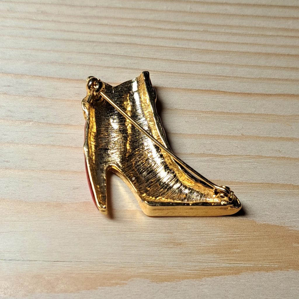 Traded 35mm x 35mm Metallic red enamel and gold-colored metal boot brooch with rhinestones