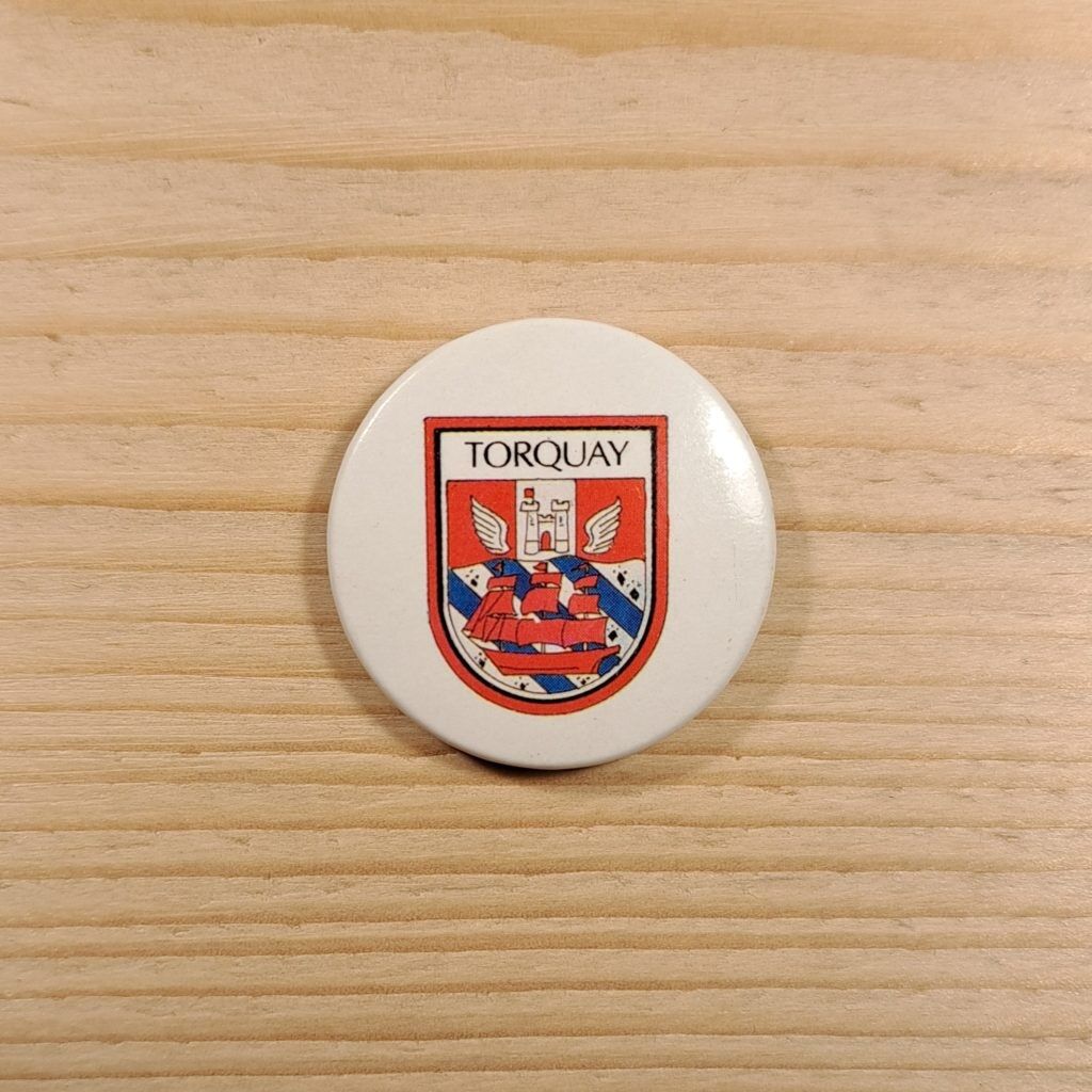 Vintage 32mm D-type pin badge souvenir from Torquay in Devon, England